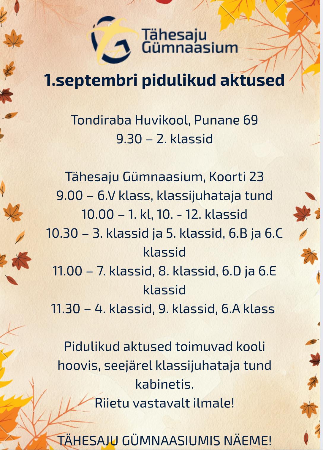 NB! Riietus peab olema ilmastikule vastav, sest pidulikud üritused toimuvad kooli hoovis.