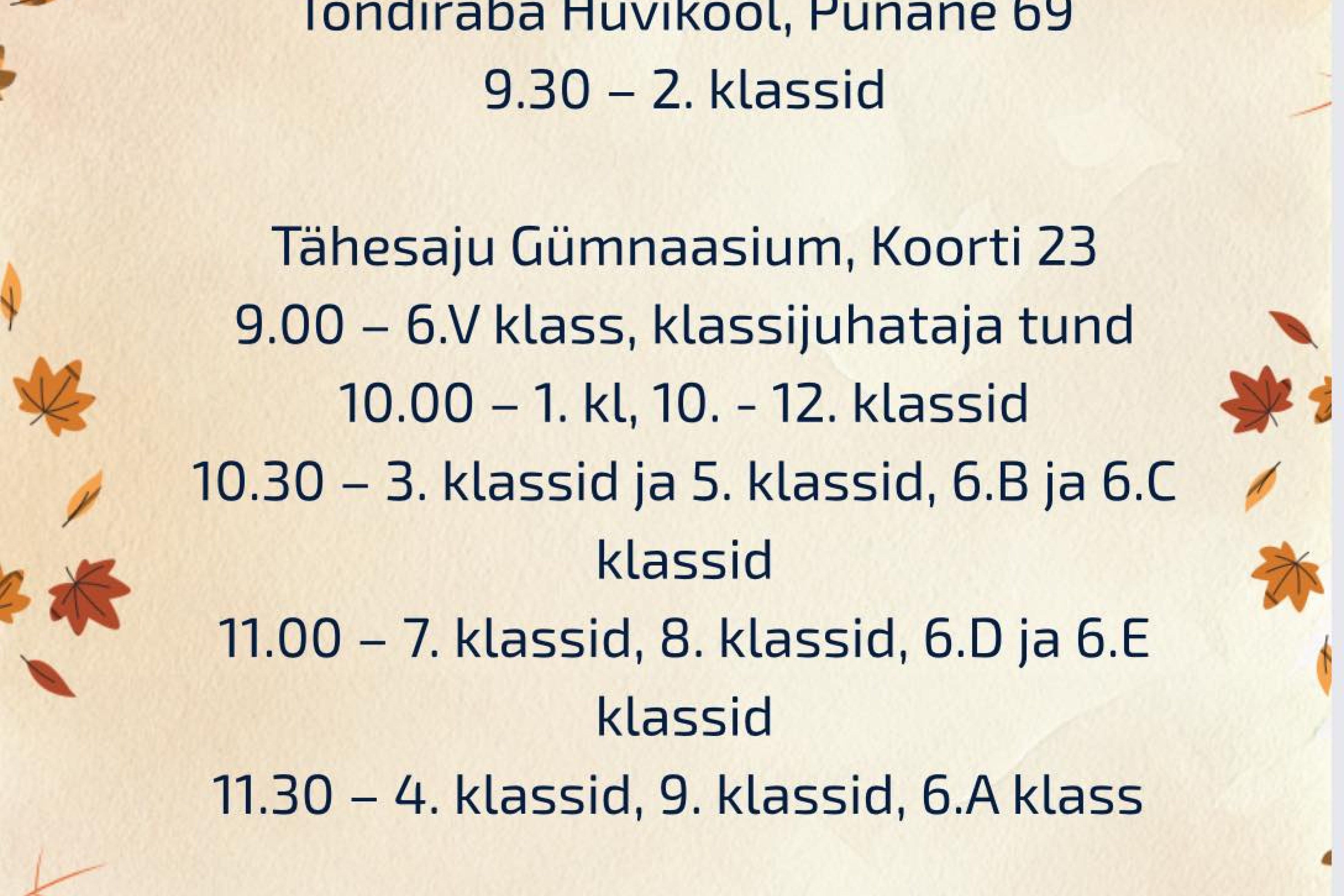 - Kl 11.30 – 4.klassid, 9.klassid, 6.a