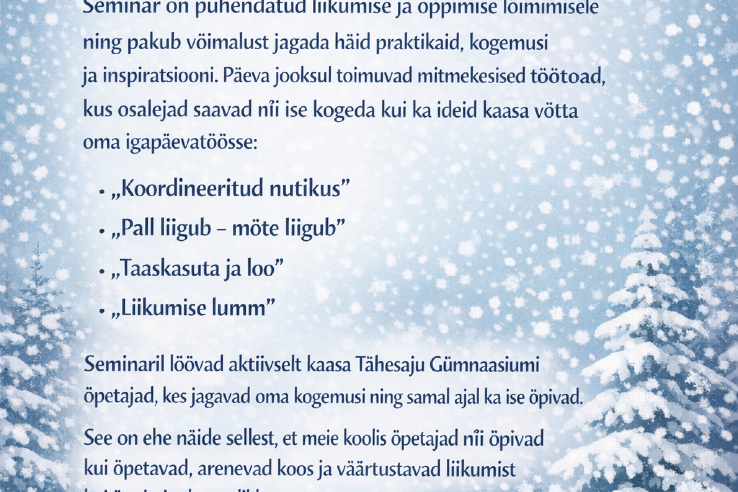 27 января в гимназии Tähesaju пройдёт семинар обмена опытом для школ-партнёров и детских садов «Liikudes targemaks» («Двигаясь — умнеем»), организованный командой Liikuma Kutsuv Kool.